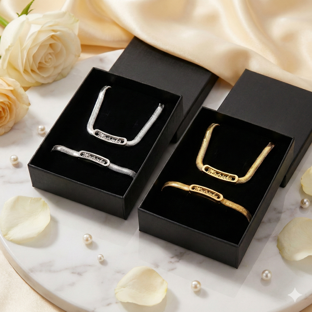 Pulseira + Colar em Malha de Aço com dedicatória Madrinha.
